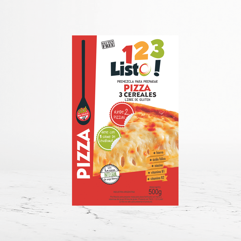 Premezcla para preparar masa para pizza fortificada con hierro y vitaminas del grupo B (Vitamina B1, Vitamina B2, niacina y ácido fólico), libre de gluten. Producto sin TACC.